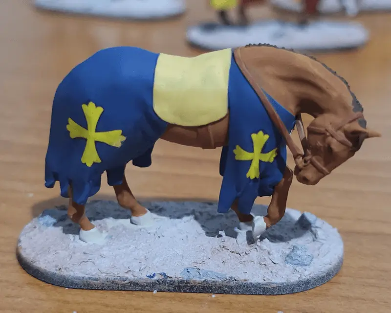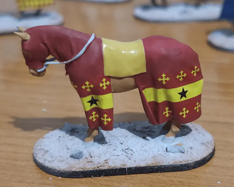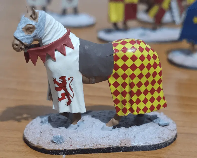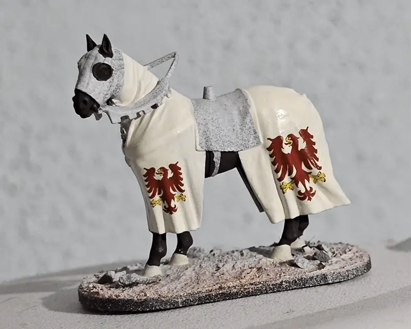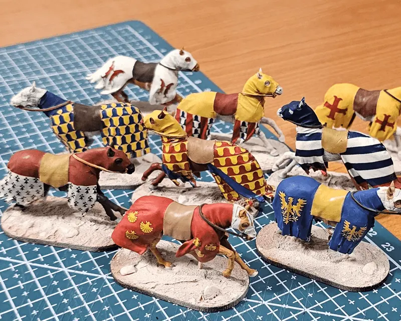 In this small tutorial, I will try to explain how you can apply heraldic caparison transfers to horses. Due to the complexity of the shapes and the fact that most caparisons (especially on horses in motion) have a large number of folds, I created the heraldry in segments (smaller and larger) to make application easier. Of course, in order to apply the transfers correctly, you must have the appropriate materials and paints—see the article ‘A Beginner’s Guide to Heraldic Waterslide Transfers’.