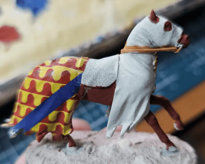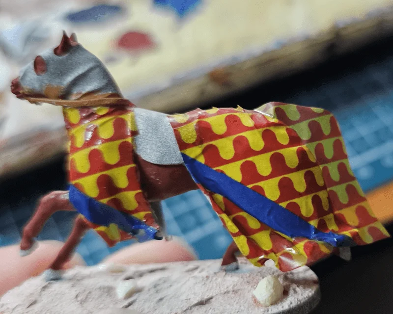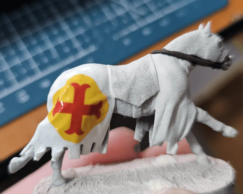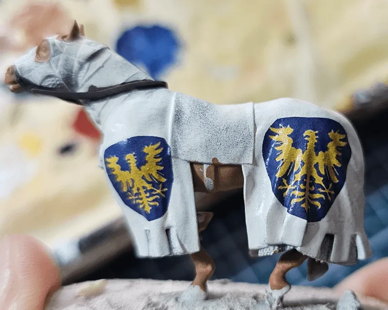 After you have completed the process and softened the transfer with decal softener, achieving the desired shape that follows the folds of the caparison, leave everything to dry. I usually continue the process after 12+ hours.