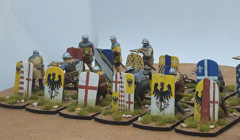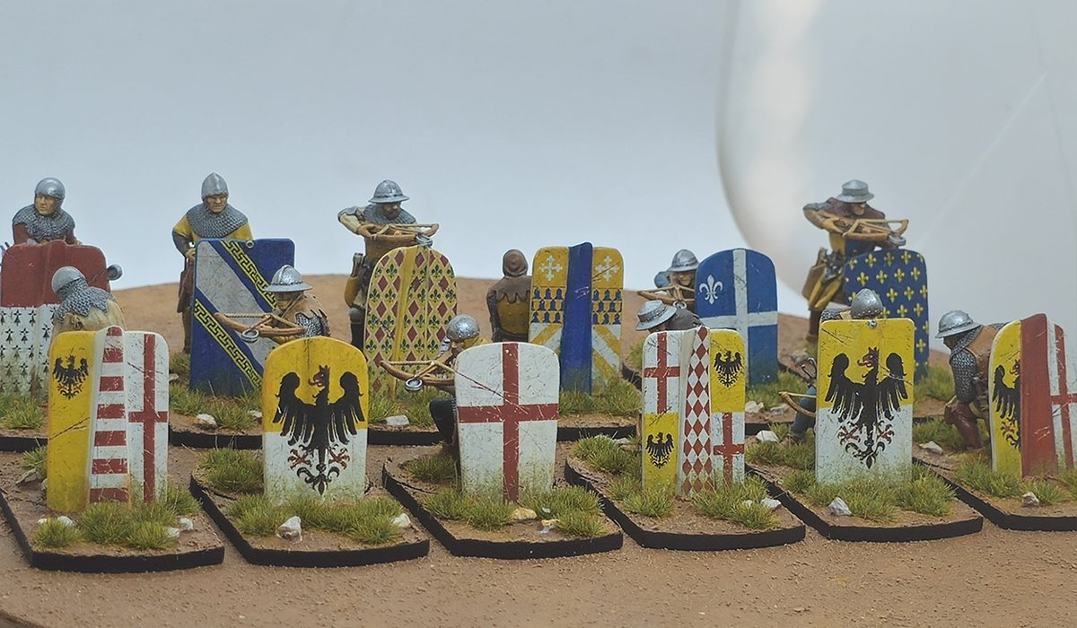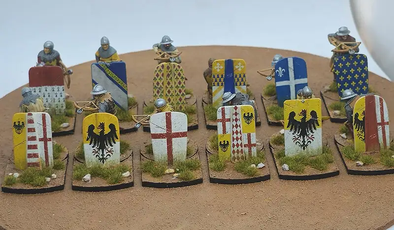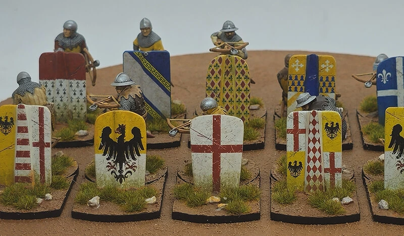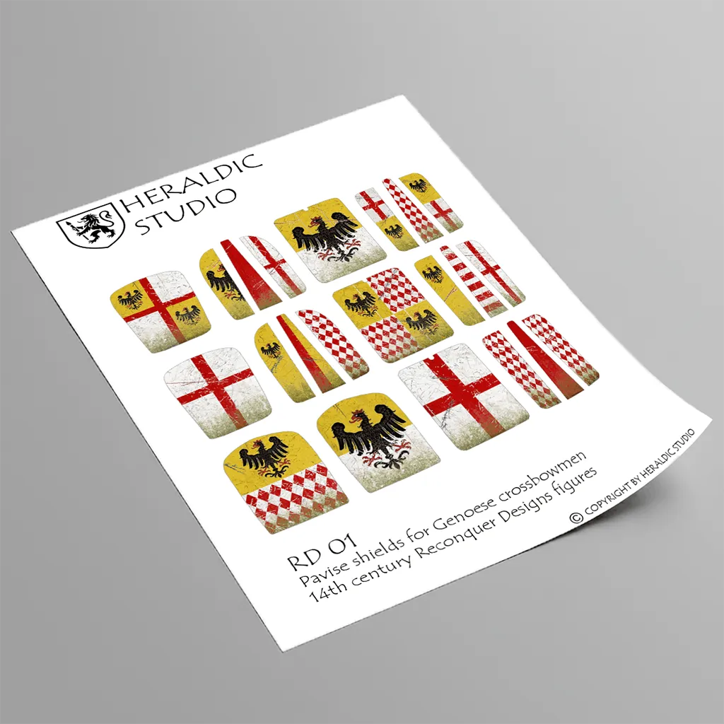 Waterslide transfer sheet with 14th-century pavise designs for Genoese crossbowmen. Sized to fit Reconquer Designs miniatures.