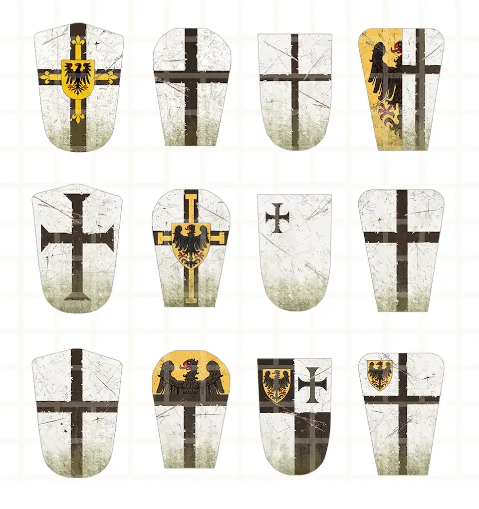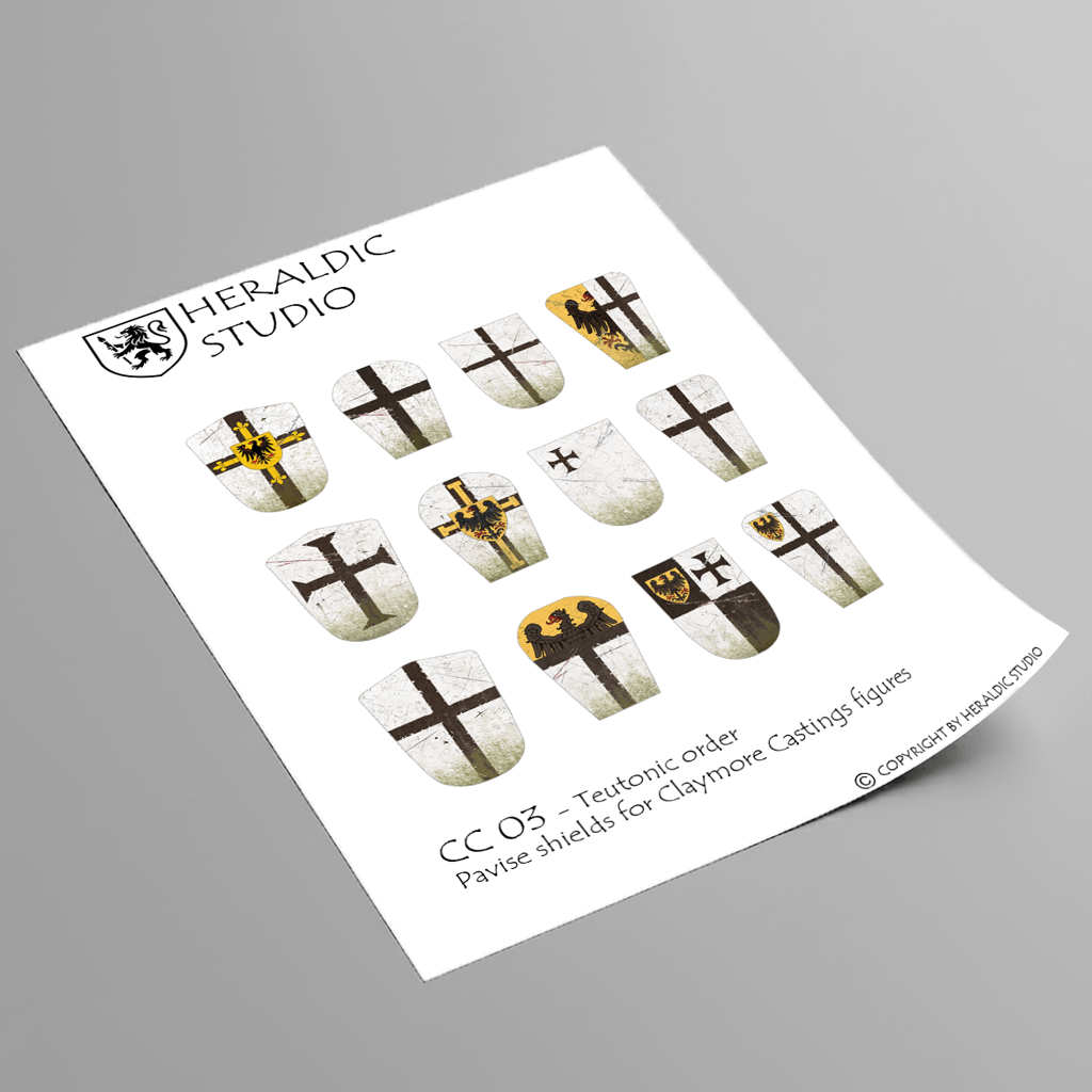 Waterslide transfer sheet (CC 03) with 12 unique, pre-weathered heraldic designs. Sized for Claymore Castings pavise shields.