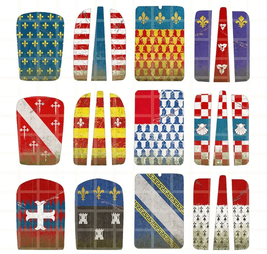 This product is a waterslide transfer sheet featuring heraldic and decorative motifs for 14th-century pavise shields, historically used by French crossbowmen.