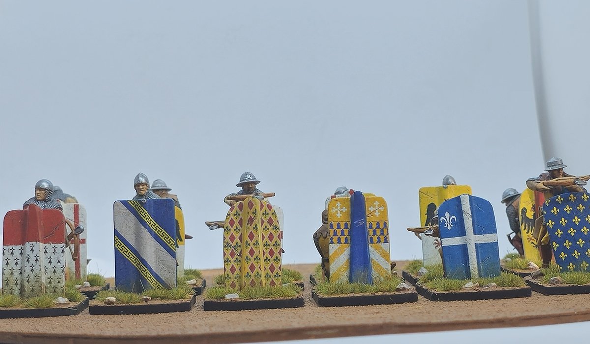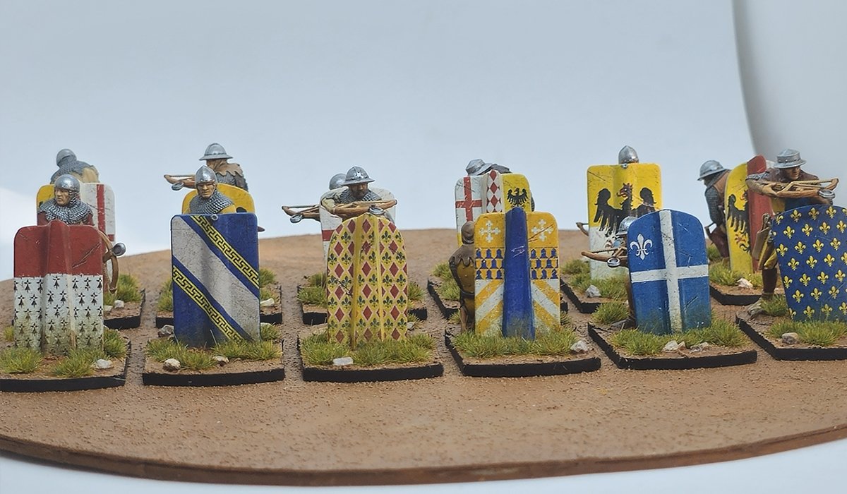 Waterslide transfer sheet with 14th-century pavise designs for French crossbowmen. Sized to fit Reconquer Designs miniatures.