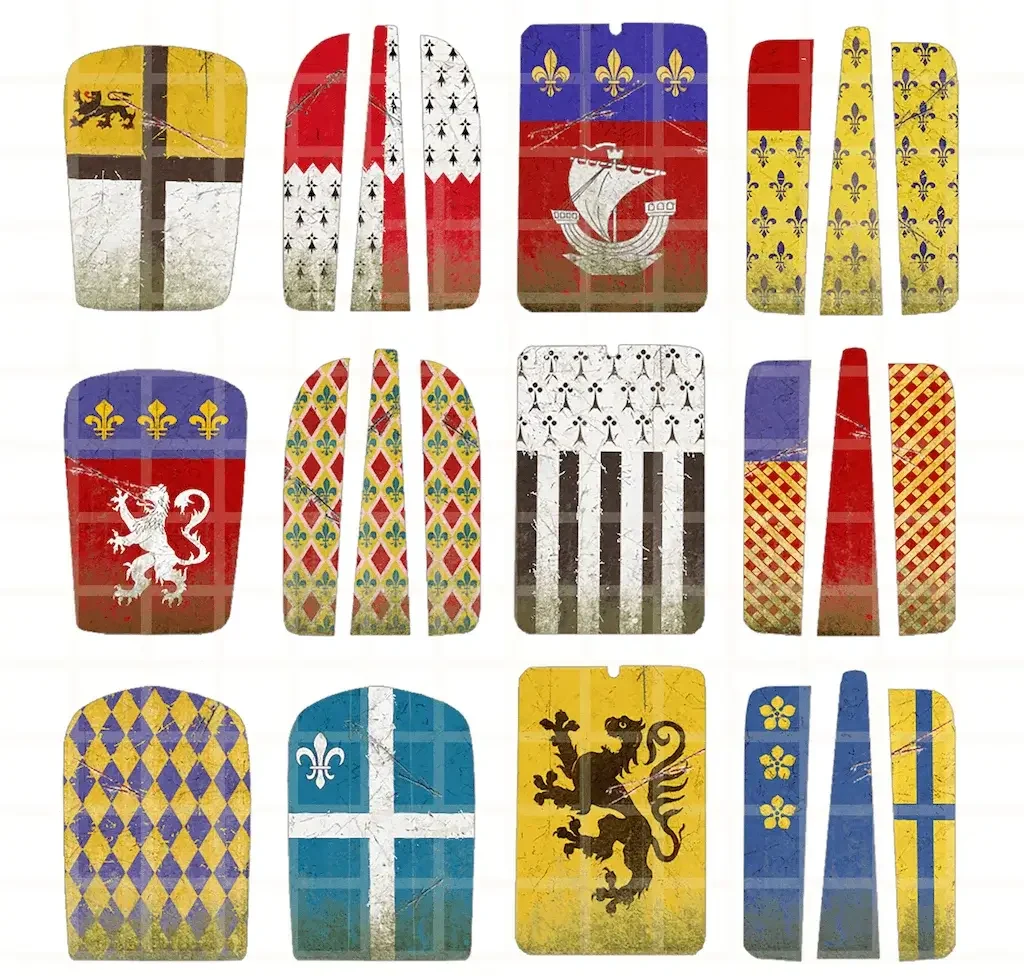 This product is a waterslide transfer sheet featuring heraldic and decorative motifs for 14th-century pavise shields, historically used by French crossbowmen.