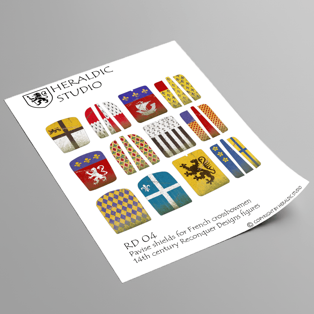 Waterslide transfer sheet with 14th-century pavise designs for French crossbowmen. Sized to fit Reconquer Designs miniatures.