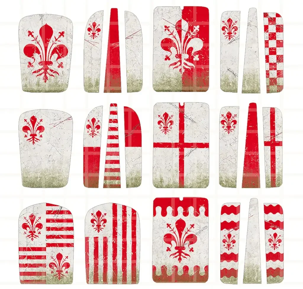 This product is a waterslide transfer sheet featuring heraldic and decorative motifs for 14th-century pavise shields, historically used by Florence crossbowmen.