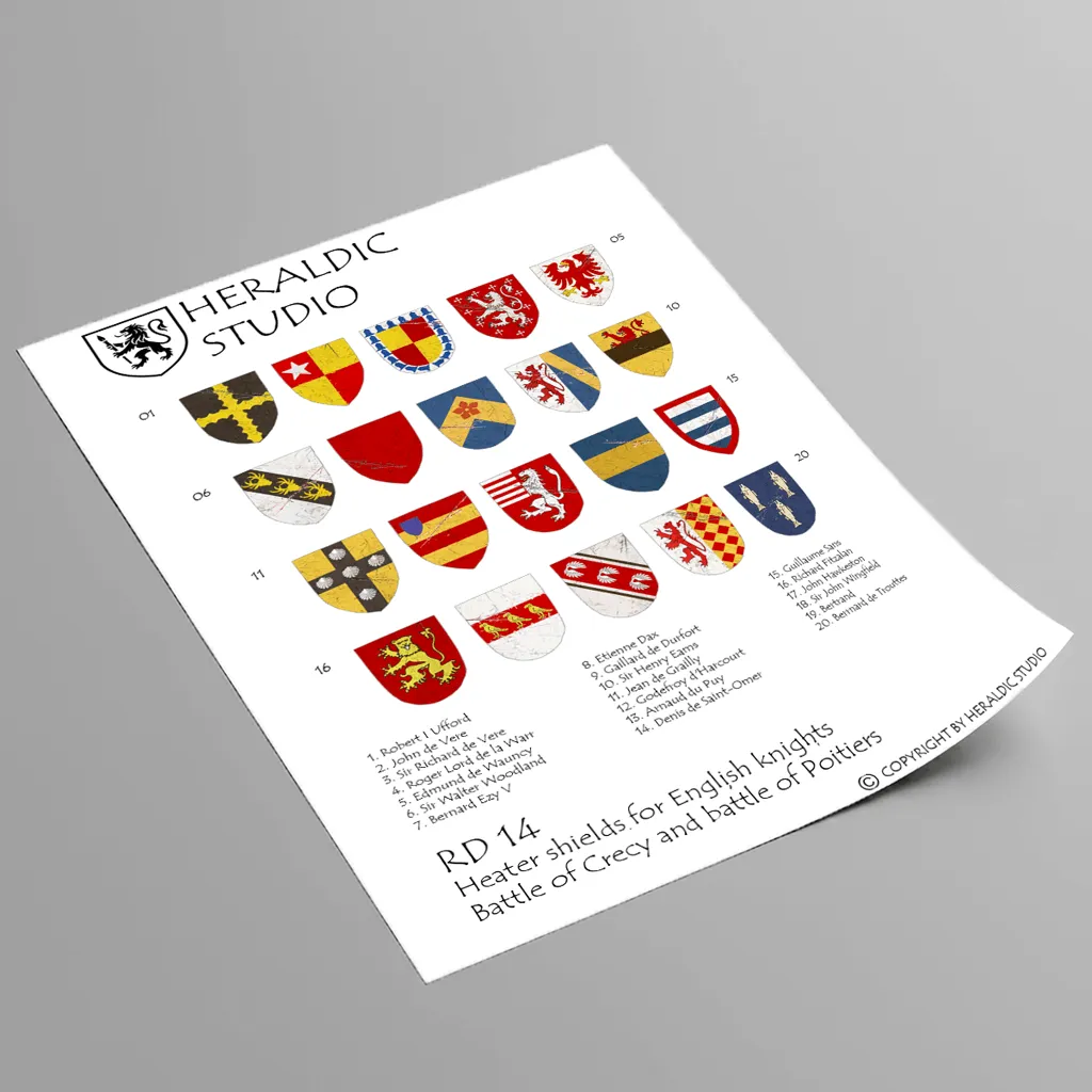 Waterslide transfer sheet (RD 14) with 20 pre-weathered heraldic designs for English knights of the Hundred Years’ War. Sized for 28mm Reconquer Designs heater shields.