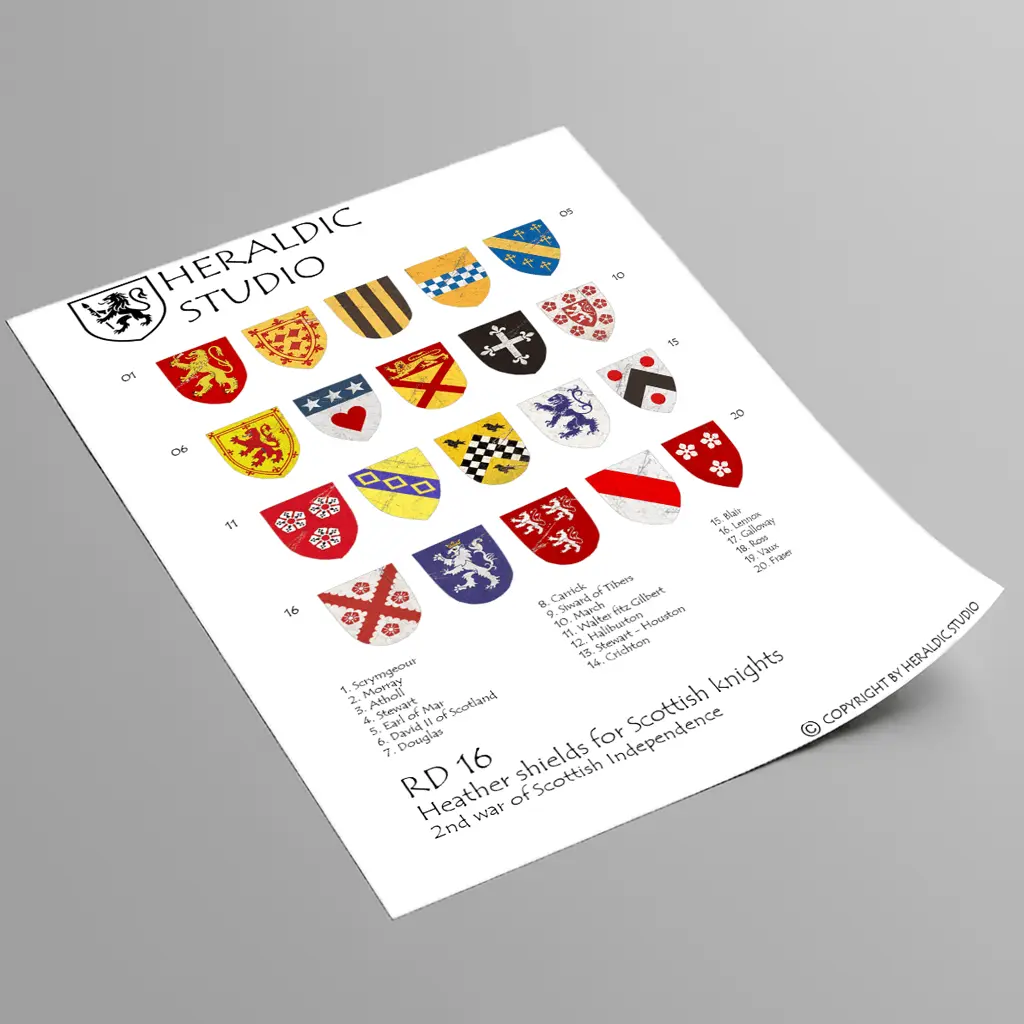Product code RD 16 is a high-resolution waterslide transfer sheet featuring 20 unique heraldic designs for 14th-century Scottish knights (2nd War of Independence).