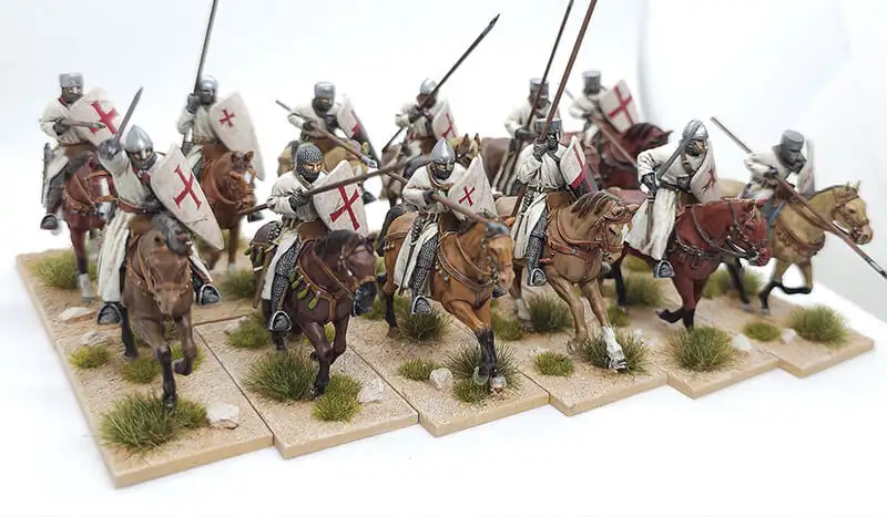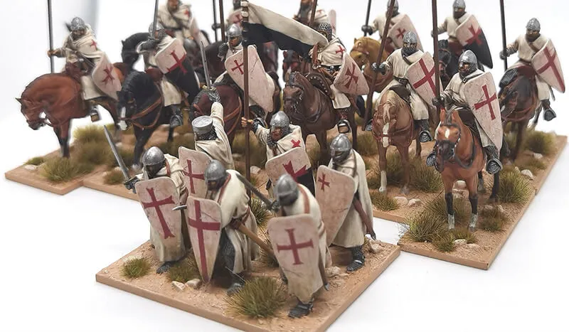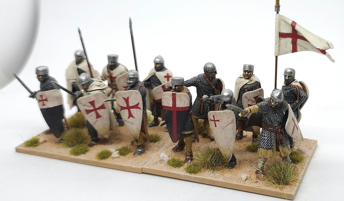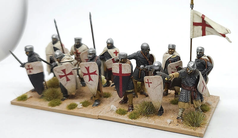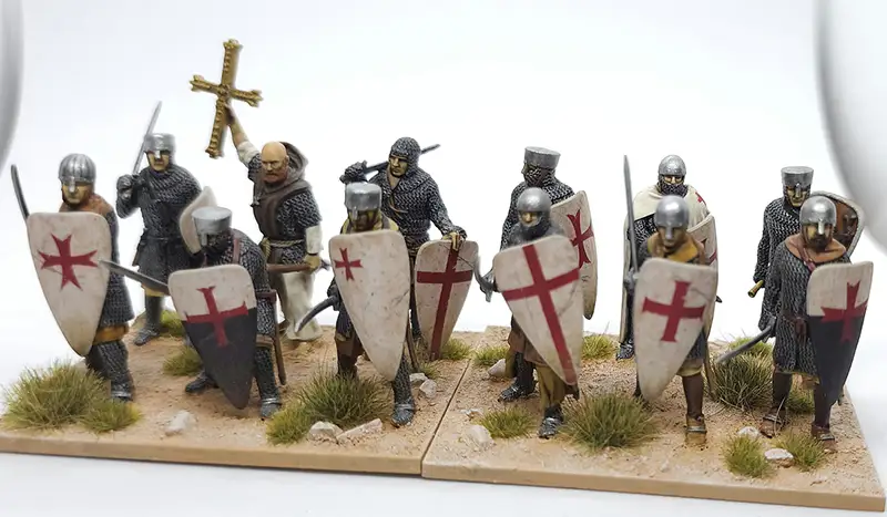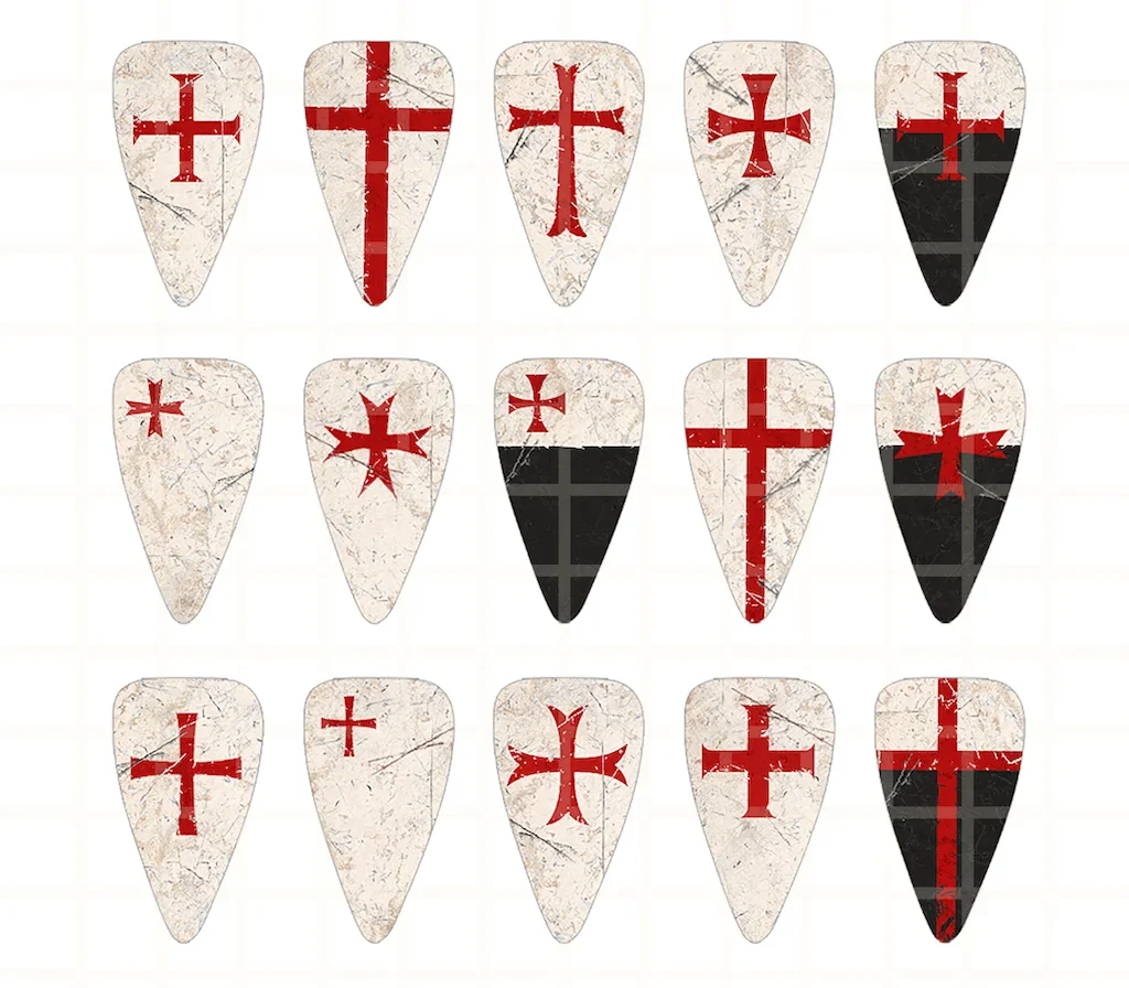 Waterslide transfer sheet (RD 20) with 15 pre-weathered Templar shield designs. Sized for 12-13th century Reconquer Designs 28mm kite shield.