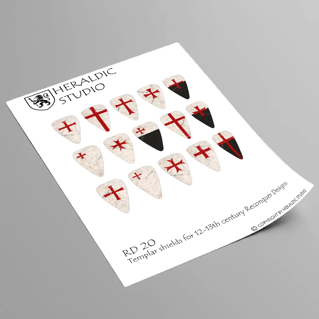 Product code RD 20 is a high-resolution waterslide transfer sheet featuring 15 unique designs for 12-13th century Templar shields.