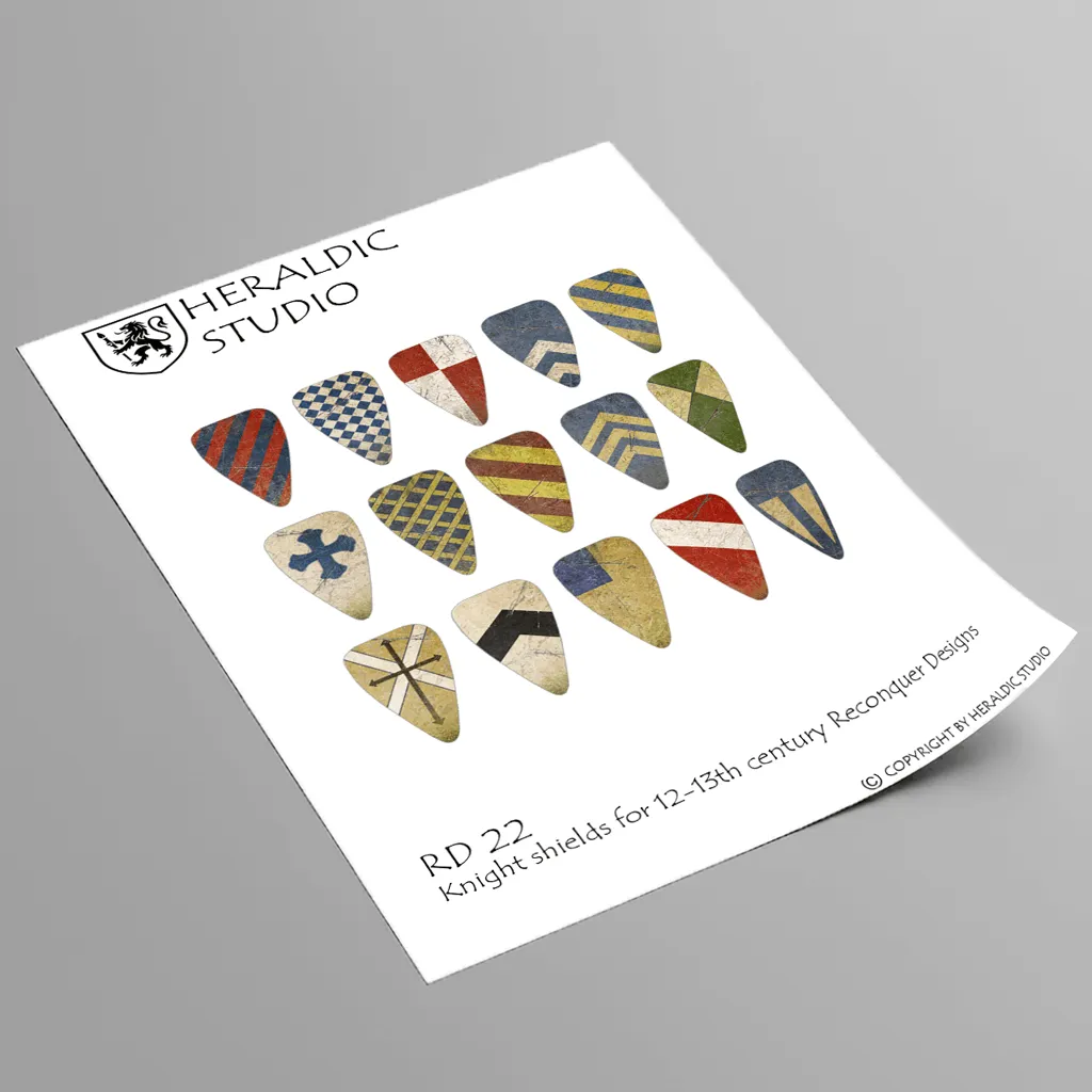 Waterslide transfer sheet (RD 22) with 15 pre-weathered heraldic shield designs. Sized for 12-13th century Reconquer Designs 28mm kite shield.