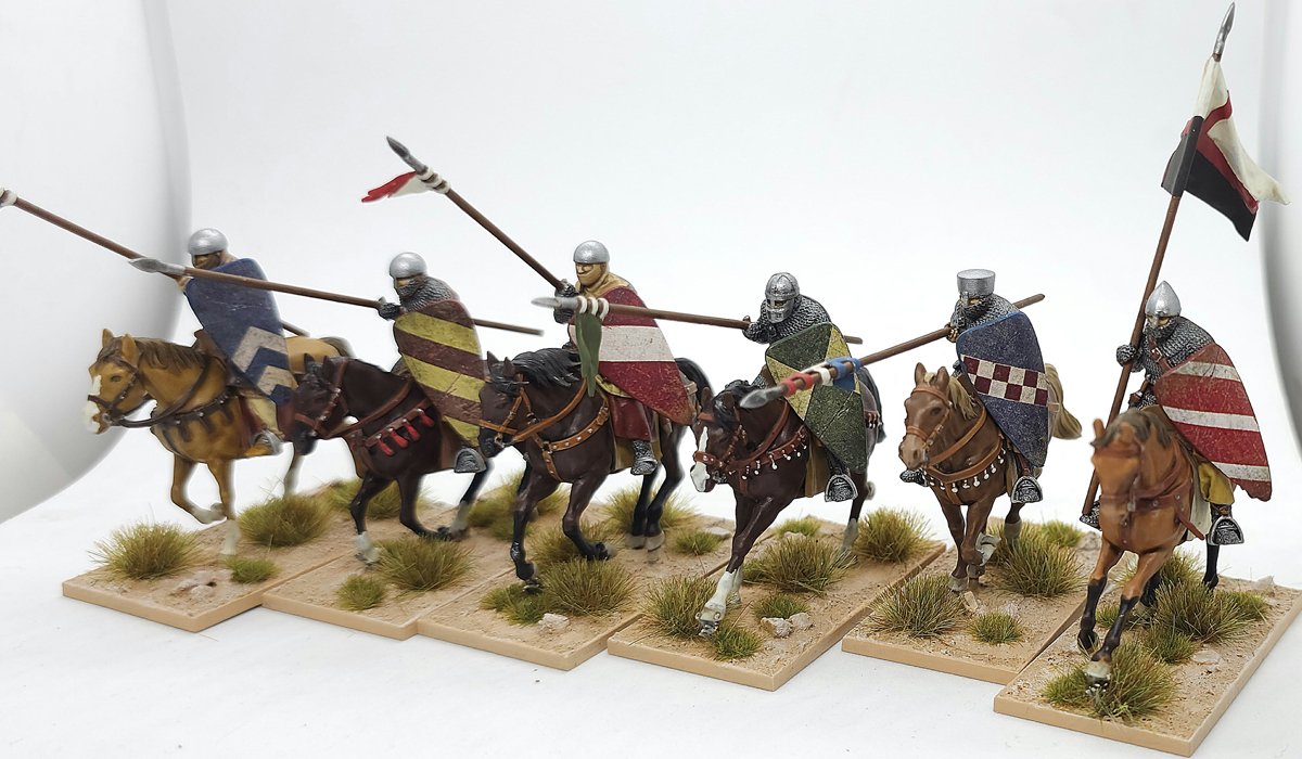 Waterslide transfer sheet (RD 23) with 15 pre-weathered heraldic shield designs. Sized for 12-13th century Reconquer Designs 28mm kite shield.