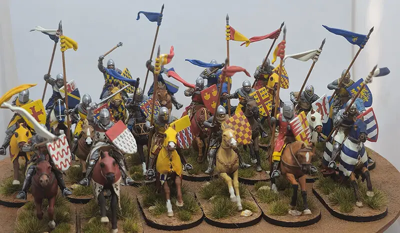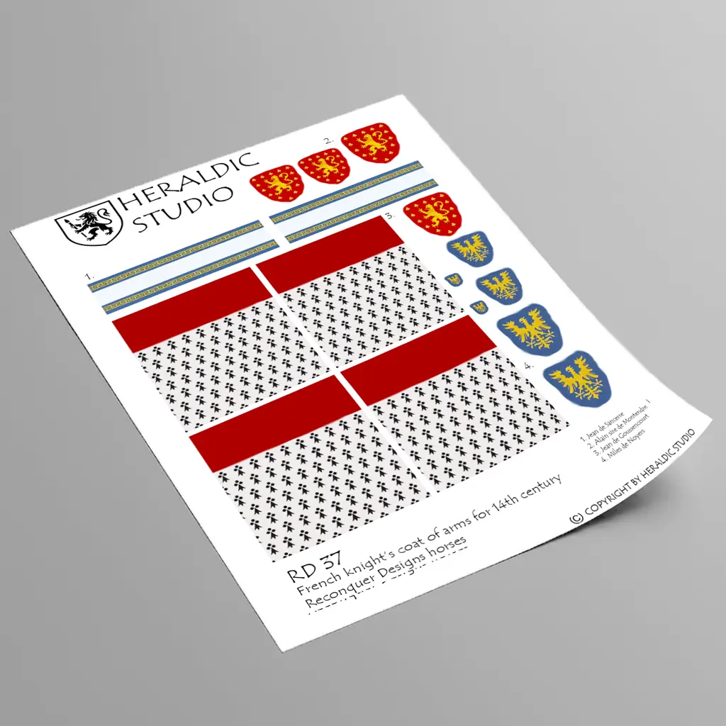 Waterslide transfer sheet with 14th-century French knight coat of arms for caparisons. Sized to fit Reconquer Designs miniatures.